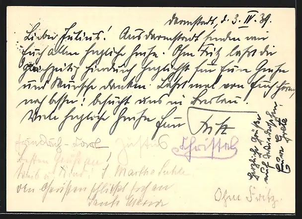 Personenbezogene Daten auf der Rückseite der Karte wurden durch blauen Textmarker unkenntlich gemacht. Die blauen Stellen sind auf die Vorderseite durchgeweicht und wirken sich negativ auf das Postkartenfoto aus