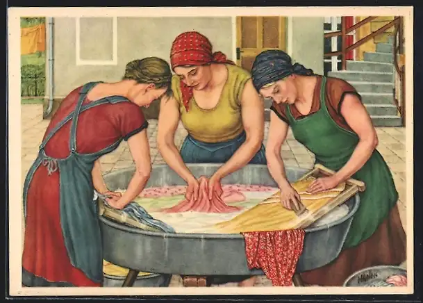 AK Wäscherinnen, Reklame für Indanthren Farben