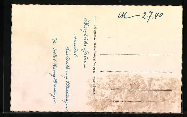 Personenbezogene Daten auf der Rückseite der Karte wurden durch blauen Textmarker unkenntlich gemacht. Die blauen Stellen sind auf die Vorderseite durchgeweicht und wirken sich negativ auf das Postkartenfoto aus