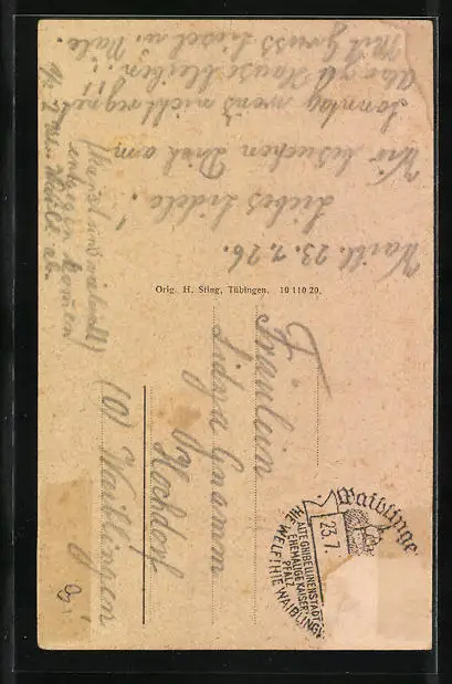 Personenbezogene Daten auf der Rückseite der Karte wurden durch blauen Textmarker unkenntlich gemacht. Die blauen Stellen sind auf die Vorderseite durchgeweicht und wirken sich negativ auf das Postkartenfoto aus