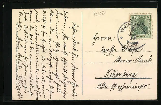 Personenbezogene Daten auf der Rückseite der Karte wurden durch blauen Textmarker unkenntlich gemacht. Die blauen Stellen sind auf die Vorderseite durchgeweicht und wirken sich negativ auf das Postkartenfoto aus