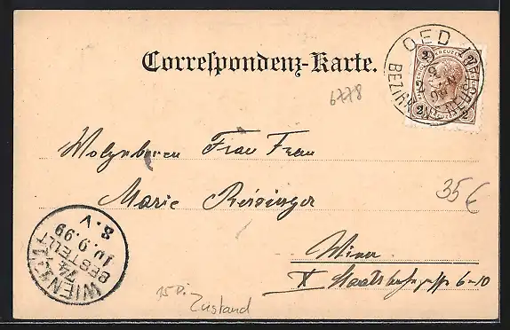 gelaufen 1899, leicht fleckig, Stempelspur, Bugspur unten mittig