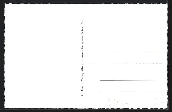 Personenbezogene Daten auf der Rückseite der Karte wurden durch blauen Textmarker unkenntlich gemacht. Die blauen Stellen sind auf die Vorderseite durchgeweicht und wirken sich negativ auf das Postkartenfoto aus