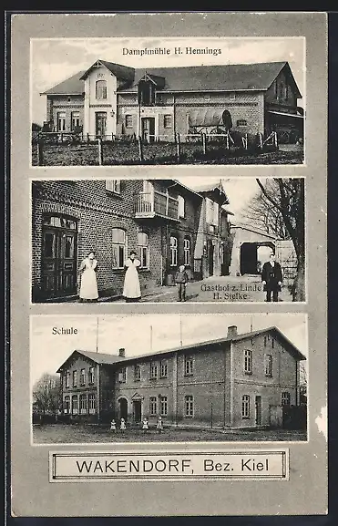 AK Wakendorf, Dampfmühle H. Hennings, Gasthof zur Linde, Schule
