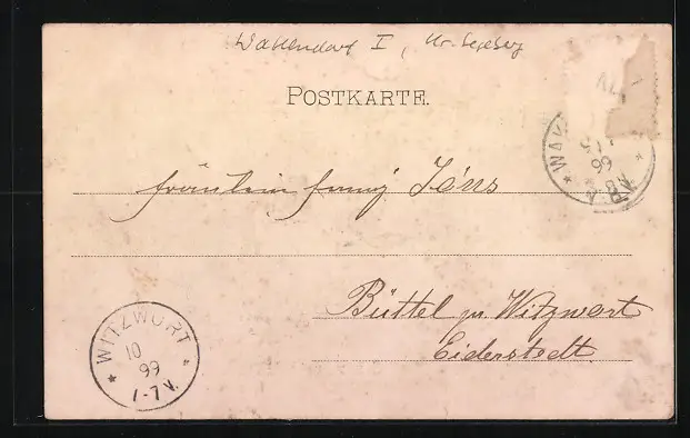 gelaufen 1899, Briefmarke entfernt, Bugspur li. unten, guter Zustand