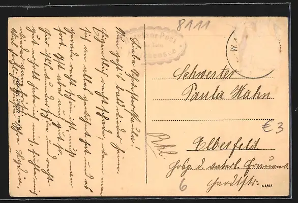 Personenbezogene Daten auf der Rückseite der Karte wurden durch blauen Textmarker unkenntlich gemacht. Die blauen Stellen sind auf die Vorderseite durchgeweicht und wirken sich negativ auf das Postkartenfoto aus
