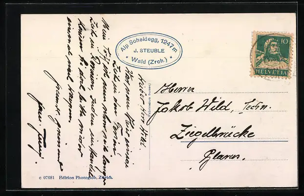 Personenbezogene Daten auf der Rückseite der Karte wurden durch blauen Textmarker unkenntlich gemacht. Die blauen Stellen sind auf die Vorderseite durchgeweicht und wirken sich negativ auf das Postkartenfoto aus
