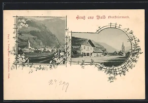 AK Wald /Obersteiermark, Ortsansicht mit Kirche, Warenhaus A. Fritz