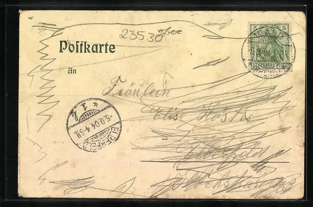 alte Ansichtskarte, gelaufen 1904, Eckknicke li. oben u. re., minimale Einrisse unten mittig, guter Zustand