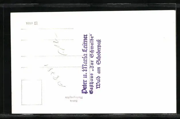 Personenbezogene Daten auf der Rückseite der Karte wurden durch blauen Textmarker unkenntlich gemacht. Die blauen Stellen sind auf die Vorderseite durchgeweicht und wirken sich negativ auf das Postkartenfoto aus
