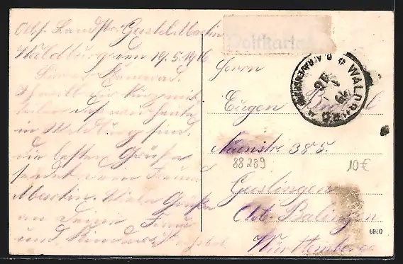 Personenbezogene Daten auf der Rückseite der Karte wurden durch blauen Textmarker unkenntlich gemacht. Die blauen Stellen sind auf die Vorderseite durchgeweicht und wirken sich negativ auf das Postkartenfoto aus
