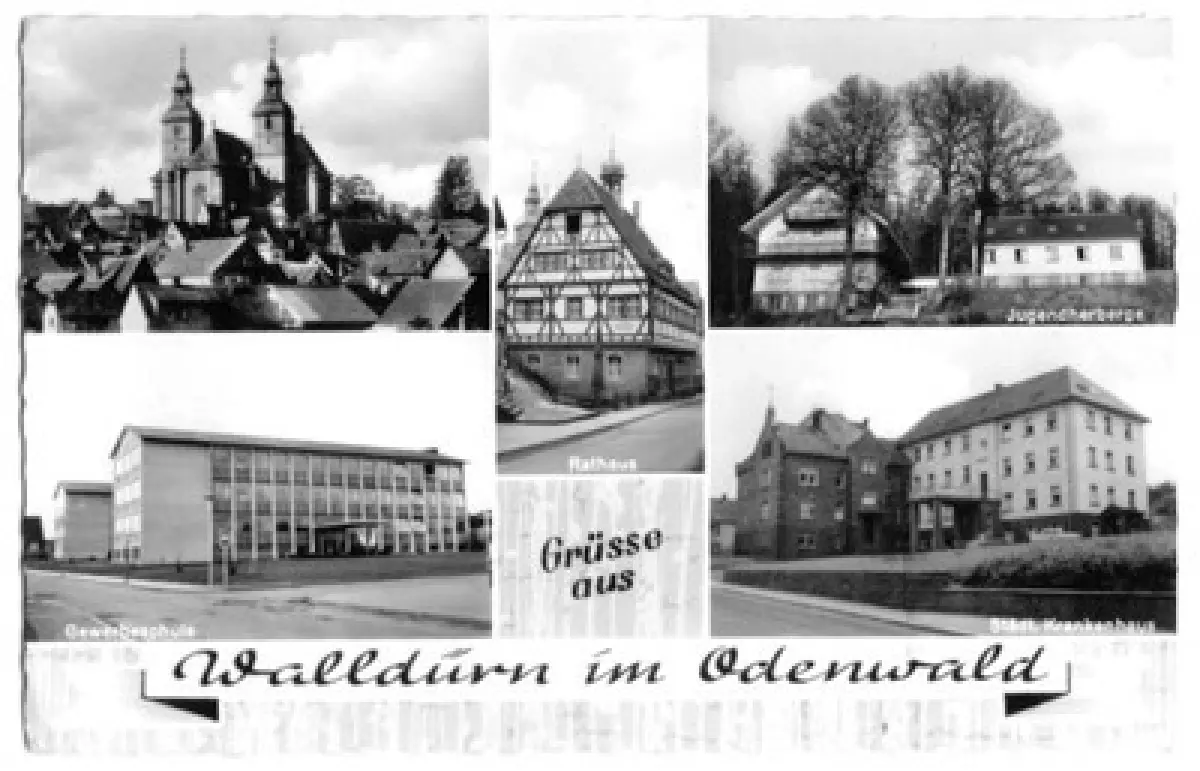 Ansichtskarte Walddürn Odw. fünf Abb. - Teilansicht, Rathaus, Jugendherberge, Gewerbeschule, Städt. Krankenhaus Erhaltung I-II postalisch gelaufen, gestempelt: Crailsheim, 4.1.66