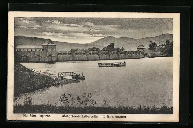 AK Waldeck, Edertalsperre, Motorboot-Haltestelle mit Sperrmauer