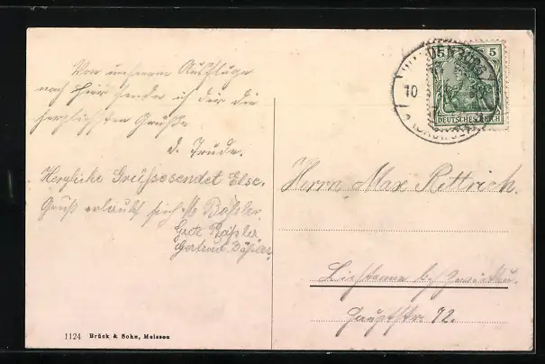 Personenbezogene Daten auf der Rückseite der Karte wurden durch blauen Textmarker unkenntlich gemacht. Die blauen Stellen sind auf die Vorderseite durchgeweicht und wirken sich negativ auf das Postkartenfoto aus