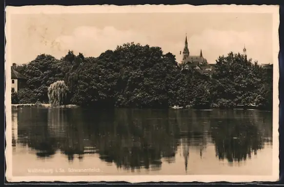 AK Waldenburg i. Sa., Schwanenteich mit Kirche