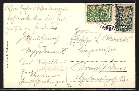 Personenbezogene Daten auf der Rückseite der Karte wurden durch blauen Textmarker unkenntlich gemacht. Die blauen Stellen sind auf die Vorderseite durchgeweicht und wirken sich negativ auf das Postkartenfoto aus