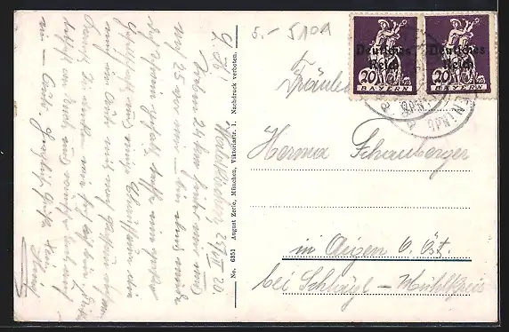 gelaufen 1920, Eckknick rechts oben, guter Zustand