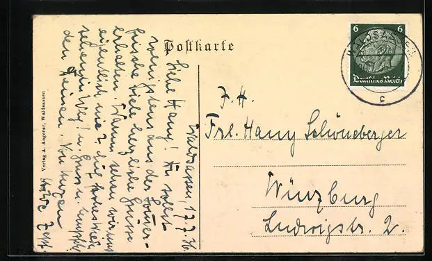 alte Ansichtskarte, gelaufen 1936, vorderseitig Klebe- und Papierreste, Oberflächenschaden, guter Zustand