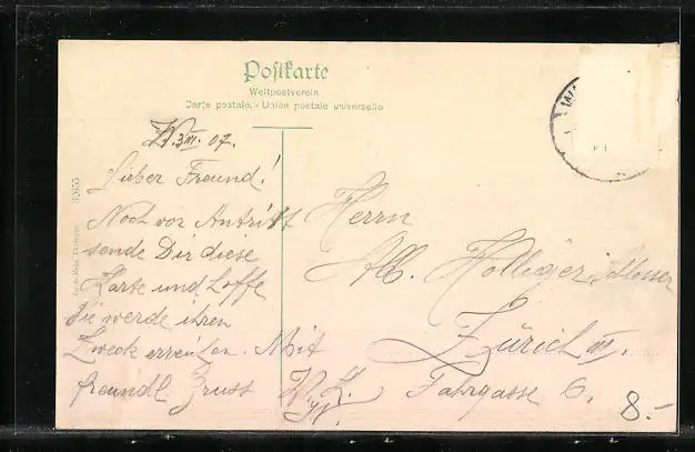 alte Ansichtskarte, gelaufen, Briefmarke entfernt, rückseitig Oberflächenschaden, Stempelspur, guter Zustand