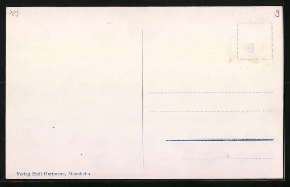 Personenbezogene Daten auf der Rückseite der Karte wurden durch blauen Textmarker unkenntlich gemacht. Die blauen Stellen sind auf die Vorderseite durchgeweicht und wirken sich negativ auf das Postkartenfoto aus