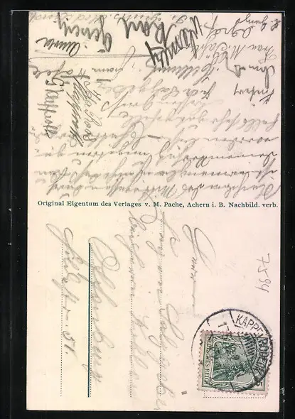 Personenbezogene Daten auf der Rückseite der Karte wurden durch blauen Textmarker unkenntlich gemacht. Die blauen Stellen sind auf die Vorderseite durchgeweicht und wirken sich negativ auf das Postkartenfoto aus