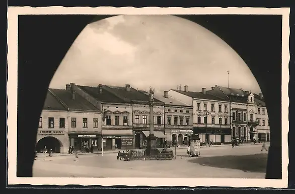 AK Wallachisch-Meseritsch, Strassenpartie mit Denkmal durch Tor