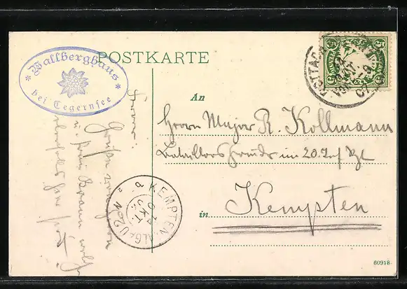 Personenbezogene Daten auf der Rückseite der Karte wurden durch blauen Textmarker unkenntlich gemacht. Die blauen Stellen sind auf die Vorderseite durchgeweicht und wirken sich negativ auf das Postkartenfoto aus