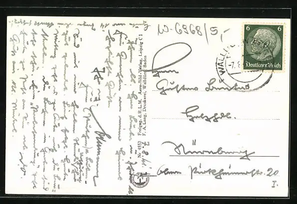 Personenbezogene Daten auf der Rückseite der Karte wurden durch blauen Textmarker unkenntlich gemacht. Die blauen Stellen sind auf die Vorderseite durchgeweicht und wirken sich negativ auf das Postkartenfoto aus