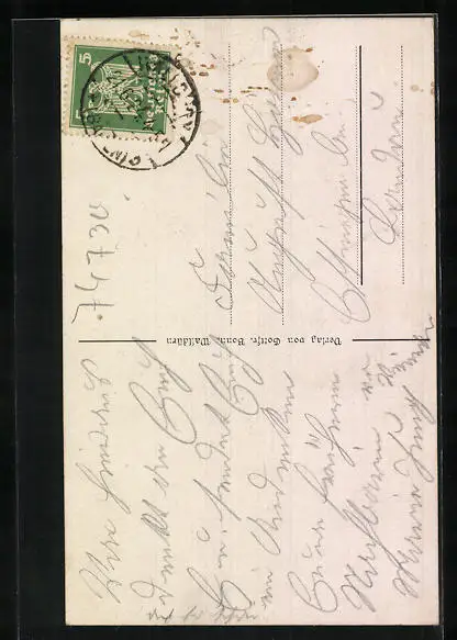 Personenbezogene Daten auf der Rückseite der Karte wurden durch blauen Textmarker unkenntlich gemacht. Die blauen Stellen sind auf die Vorderseite durchgeweicht und wirken sich negativ auf das Postkartenfoto aus