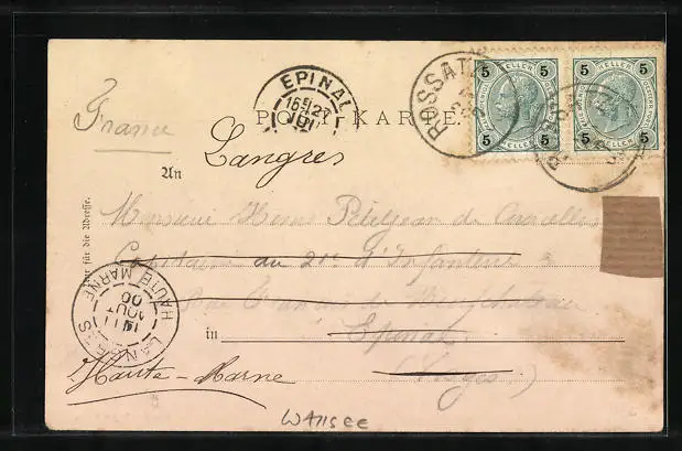 alte Ansichtskarte, gelaufen 1900, rückseitig Klebe- und Papierreste, Stempelspur, Einriss li. mittig, guter Zustand