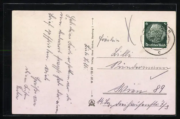 Personenbezogene Daten auf der Rückseite der Karte wurden durch blauen Textmarker unkenntlich gemacht. Die blauen Stellen sind auf die Vorderseite durchgeweicht und wirken sich negativ auf das Postkartenfoto aus