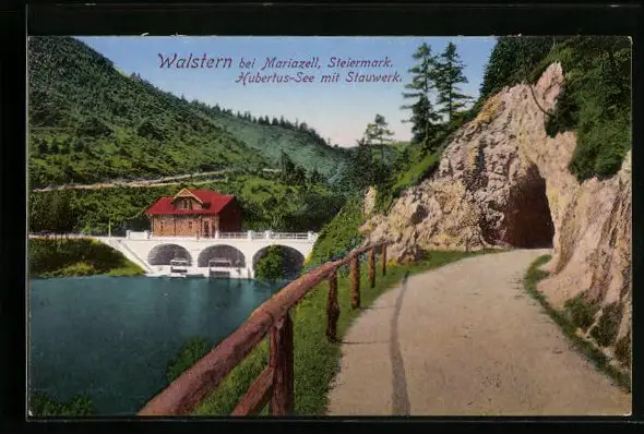 AK Walstern bei Mariazell, Hubertus-See mit Stauwerk