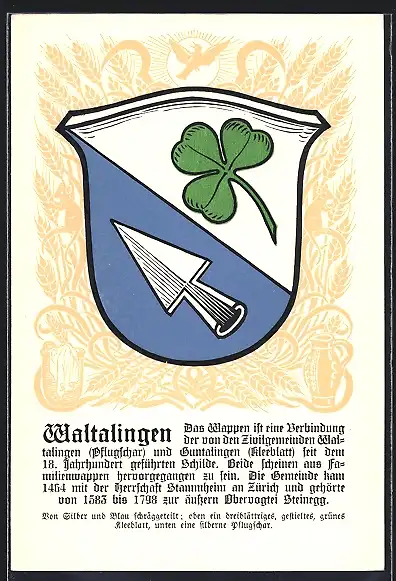 AK Waltalingen, Wappen auf Ähren-Ornamenten, Vogel, Sicheln, Info-Text