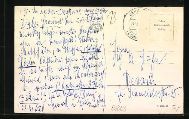 Personenbezogene Daten auf der Rückseite der Karte wurden durch blauen Textmarker unkenntlich gemacht. Die blauen Stellen sind auf die Vorderseite durchgeweicht und wirken sich negativ auf das Postkartenfoto aus