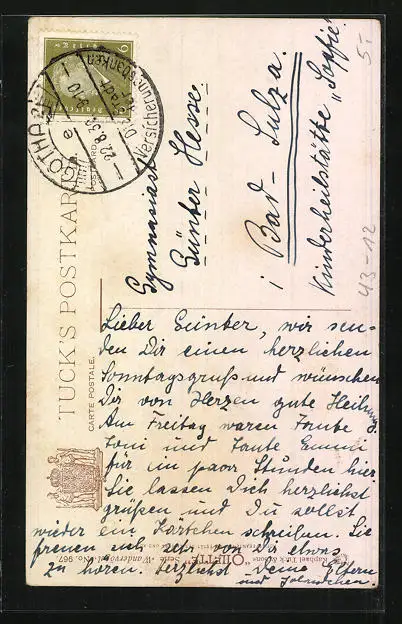 Personenbezogene Daten auf der Rückseite der Karte wurden durch blauen Textmarker unkenntlich gemacht. Die blauen Stellen sind auf die Vorderseite durchgeweicht und wirken sich negativ auf das Postkartenfoto aus