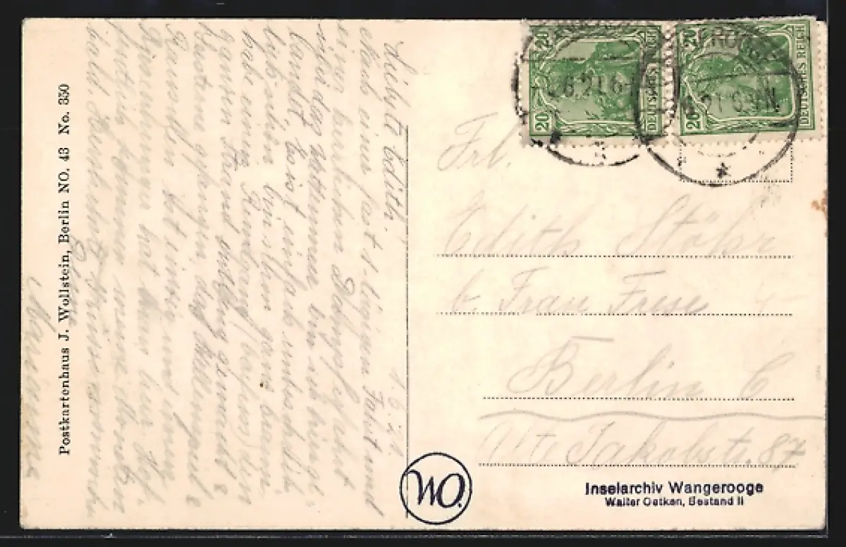 Personenbezogene Daten auf der Rückseite der Karte wurden durch blauen Textmarker unkenntlich gemacht. Die blauen Stellen sind auf die Vorderseite durchgeweicht und wirken sich negativ auf das Postkartenfoto aus