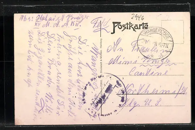 Personenbezogene Daten auf der Rückseite der Karte wurden durch blauen Textmarker unkenntlich gemacht. Die blauen Stellen sind auf die Vorderseite durchgeweicht und wirken sich negativ auf das Postkartenfoto aus