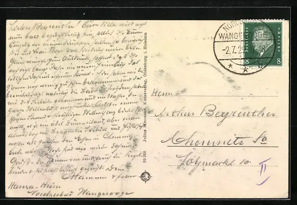 Personenbezogene Daten auf der Rückseite der Karte wurden durch blauen Textmarker unkenntlich gemacht. Die blauen Stellen sind auf die Vorderseite durchgeweicht und wirken sich negativ auf das Postkartenfoto aus