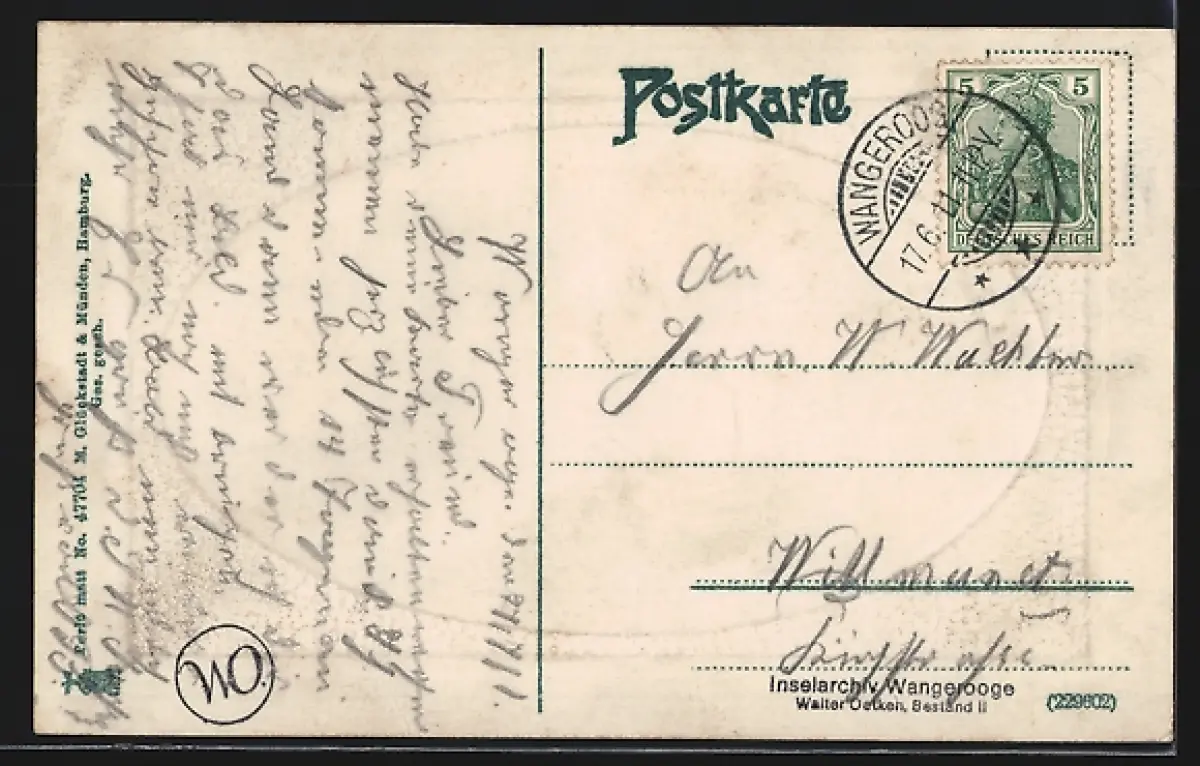 Personenbezogene Daten auf der Rückseite der Karte wurden durch blauen Textmarker unkenntlich gemacht. Die blauen Stellen sind auf die Vorderseite durchgeweicht und wirken sich negativ auf das Postkartenfoto aus