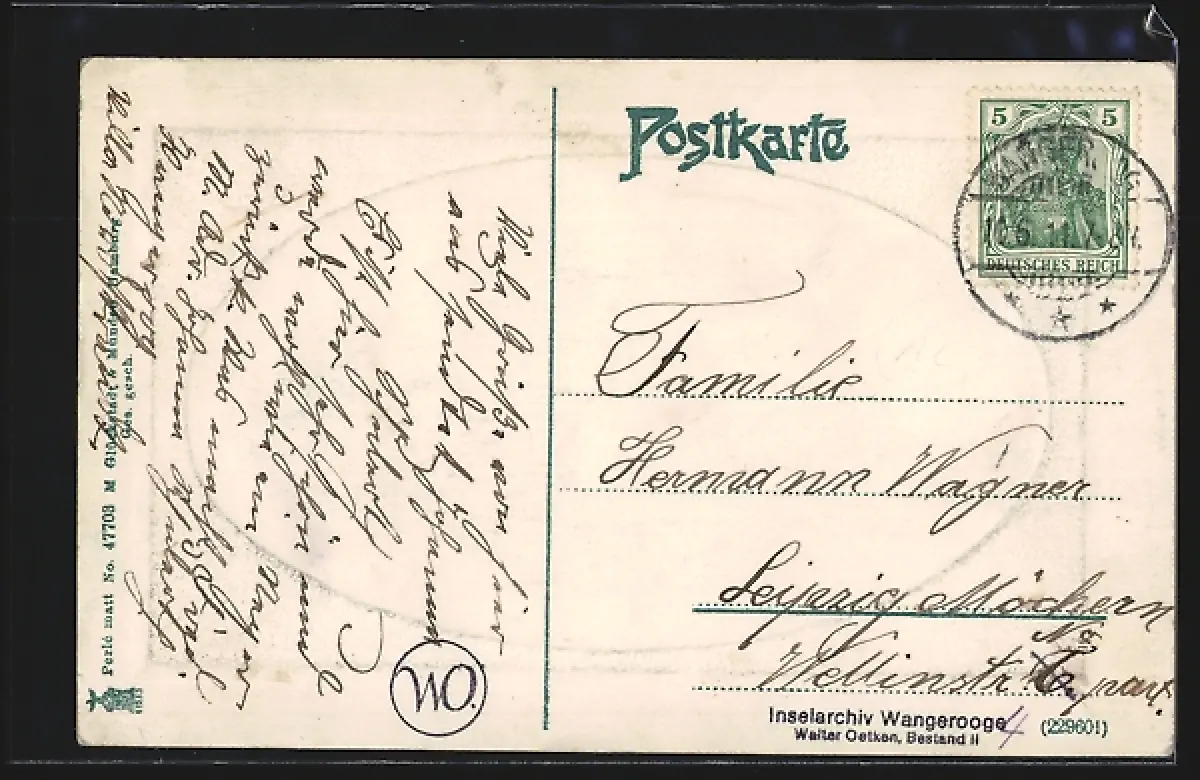 Personenbezogene Daten auf der Rückseite der Karte wurden durch blauen Textmarker unkenntlich gemacht. Die blauen Stellen sind auf die Vorderseite durchgeweicht und wirken sich negativ auf das Postkartenfoto aus