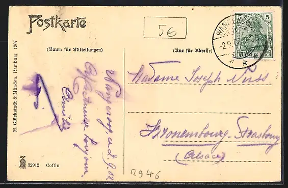 alte Ansichtskarte, gelaufen 1908, Einriss re. oben, guter Zustand