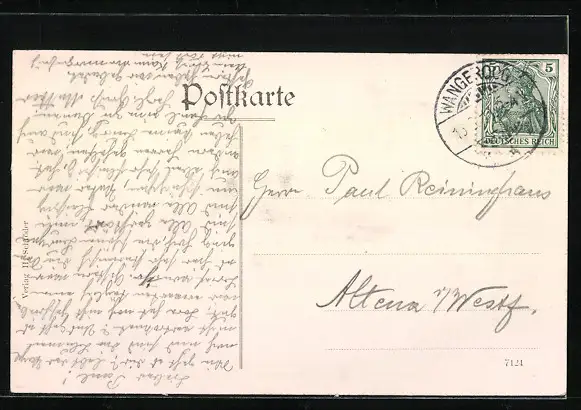 Personenbezogene Daten auf der Rückseite der Karte wurden durch blauen Textmarker unkenntlich gemacht. Die blauen Stellen sind auf die Vorderseite durchgeweicht und wirken sich negativ auf das Postkartenfoto aus