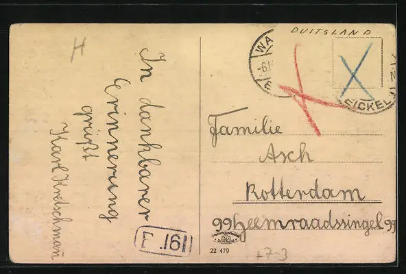 Personenbezogene Daten auf der Rückseite der Karte wurden durch blauen Textmarker unkenntlich gemacht. Die blauen Stellen sind auf die Vorderseite durchgeweicht und wirken sich negativ auf das Postkartenfoto aus