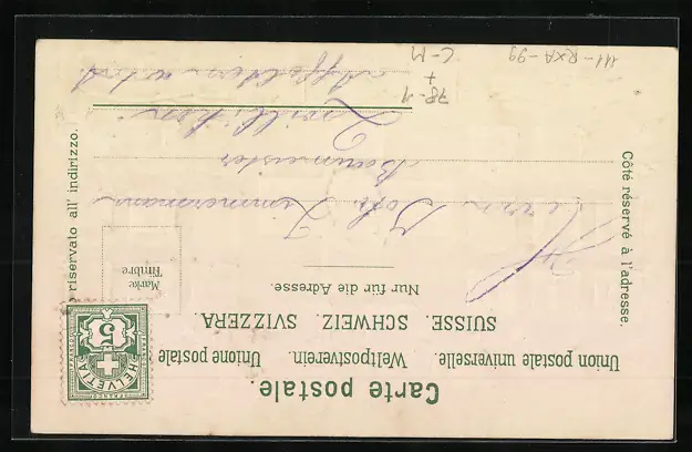 Personenbezogene Daten auf der Rückseite der Karte wurden durch blauen Textmarker unkenntlich gemacht. Die blauen Stellen sind auf die Vorderseite durchgeweicht und wirken sich negativ auf das Postkartenfoto aus