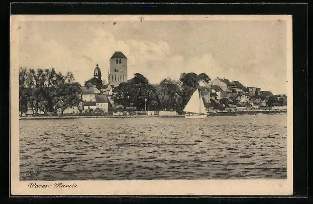 AK Waren-Müritz, Ortsansicht übers Wasser mit Segelboot