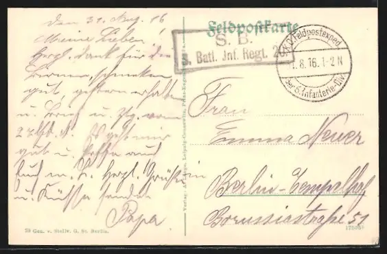 Personenbezogene Daten auf der Rückseite der Karte wurden durch blauen Textmarker unkenntlich gemacht. Die blauen Stellen sind auf die Vorderseite durchgeweicht und wirken sich negativ auf das Postkartenfoto aus