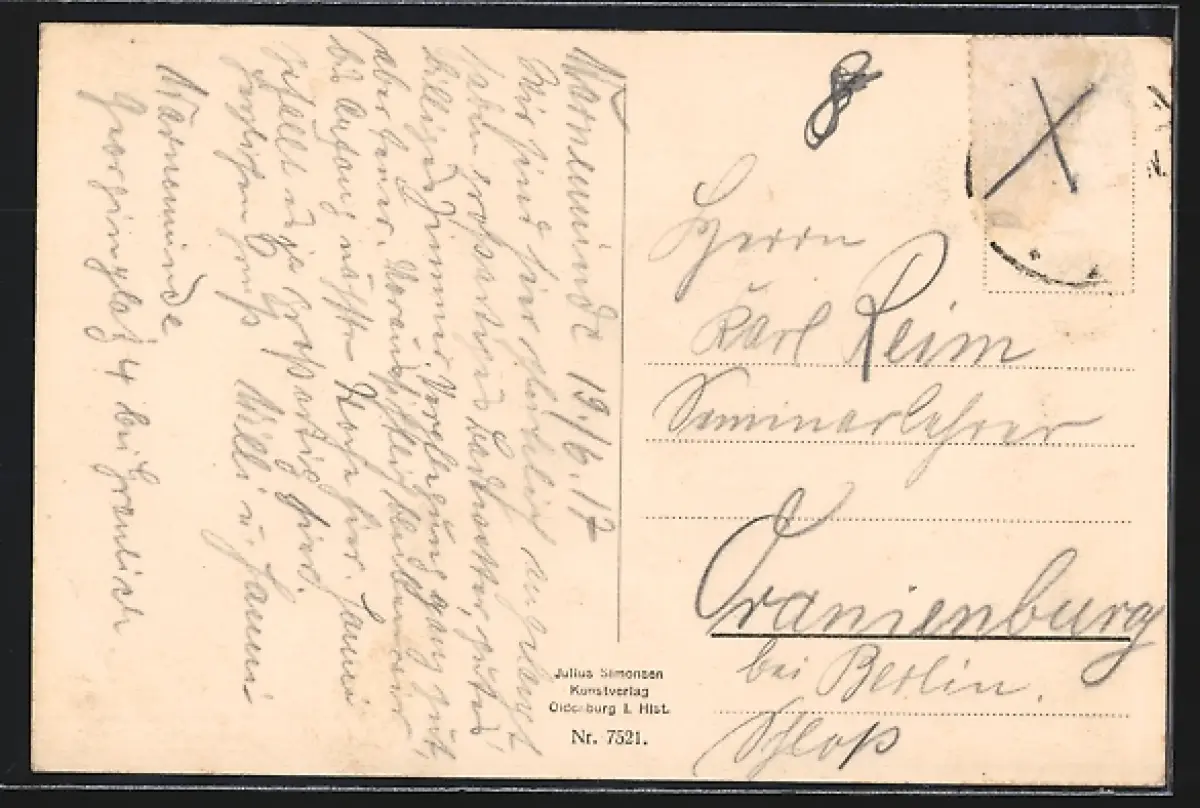 Personenbezogene Daten auf der Rückseite der Karte wurden durch blauen Textmarker unkenntlich gemacht. Die blauen Stellen sind auf die Vorderseite durchgeweicht und wirken sich negativ auf das Postkartenfoto aus