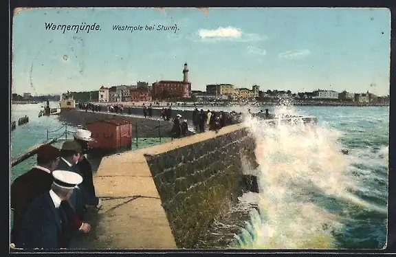 AK Warnemünde /Ostsee, Westmole bei Sturm
