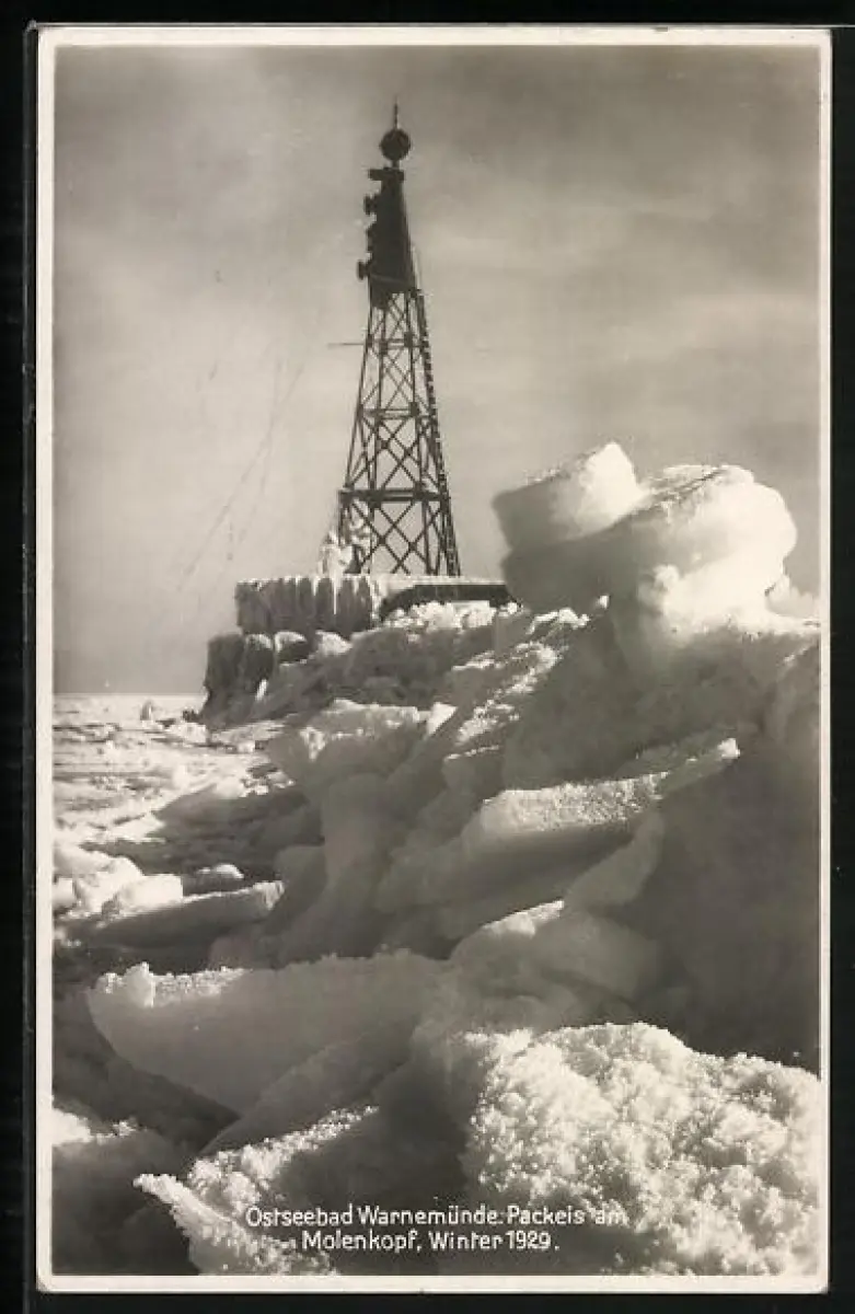 AK Warnemünde, Ostseebad, Packeis am Molenkopf im Winter 1929, Unwetter