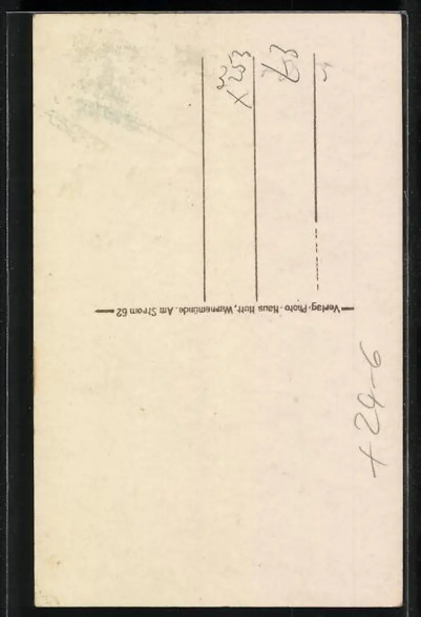 Personenbezogene Daten auf der Rückseite der Karte wurden durch blauen Textmarker unkenntlich gemacht. Die blauen Stellen sind auf die Vorderseite durchgeweicht und wirken sich negativ auf das Postkartenfoto aus